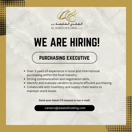 About the Company : Al Aabdi Holding LLC operates in the expanding foodservice industry, supporting restaurants, catering businesses, and food distribution networks. Our procurement function plays a critical role in ensuring quality control, cost efficiency, and uninterrupted supply chain operations.