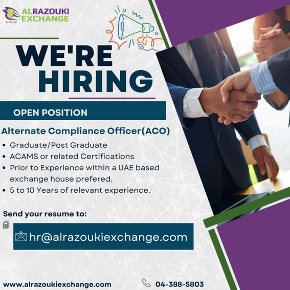 If you have strong compliance expertise, relevant certifications (ACAMS or similar), and experience in the UAE exchange sector, we invite you to join our team.