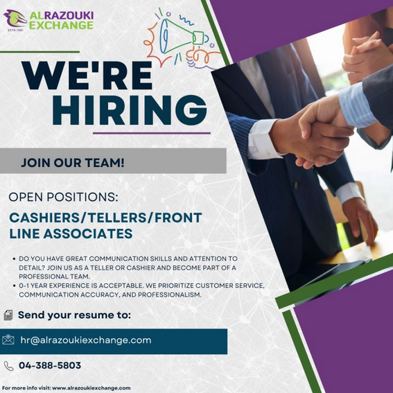 We’re hiring at Al Razouki Exchange!!!!