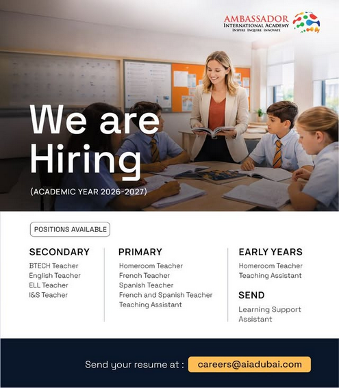 Working with Ambassador International Academy provides exposure to international education standards and modern teaching methodologies. It is an excellent choice for educators seeking career growth in a global learning environment.Ambassador International Academy stands out as a forward-thinking institution in Dubai’s education sector. With its IB curriculum, advanced facilities, and focus on holistic development, it continues to prepare students for success in higher education and global careers.