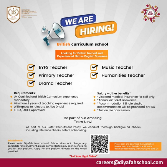 Diyafah International School is hiring for the below positions for the next Academic Year 26-27.