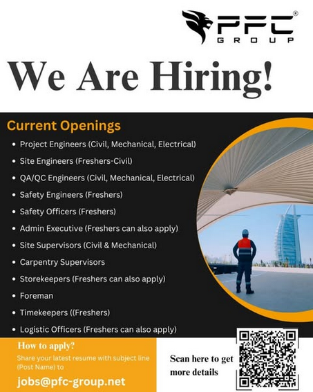 PFC Group is officially hiring for multiple roles across engineering, safety, and site operations. Whether you are an experienced professional or a motivated fresher looking to kickstart your career, we have a place for you.